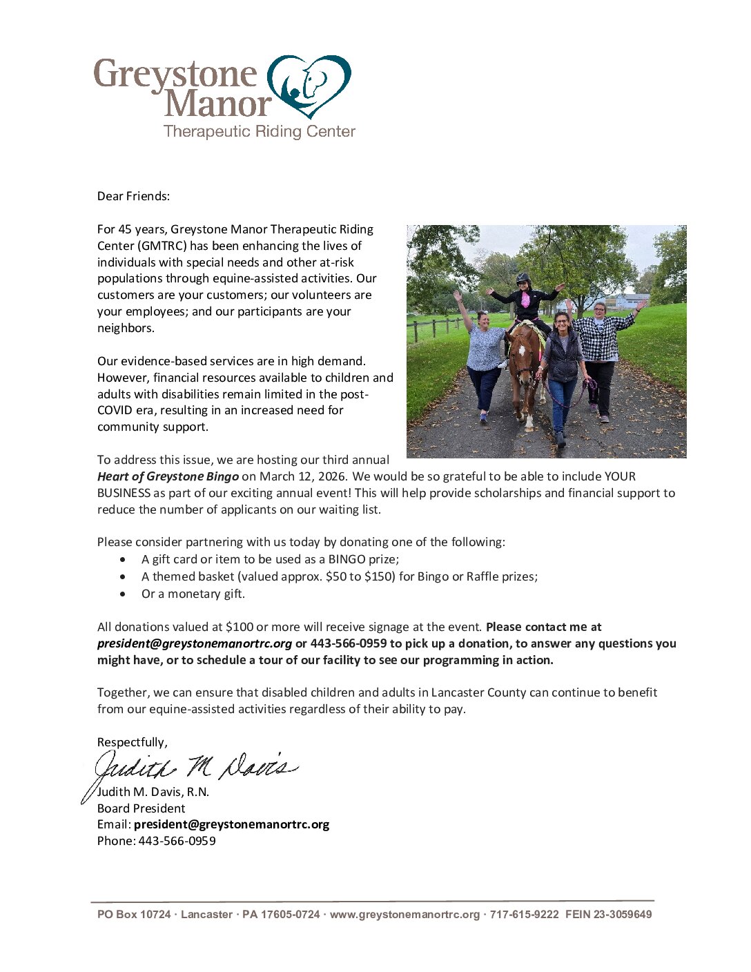 Greystone Manor TRC will host its third annual Heart of Greystone Bingo on March 12, 2026, a fun and meaningful event that directly supports their mission to provide therapeutic riding and equine-assisted learning opportunities.